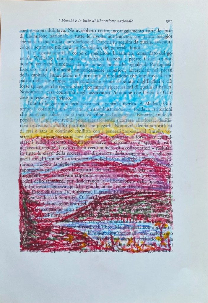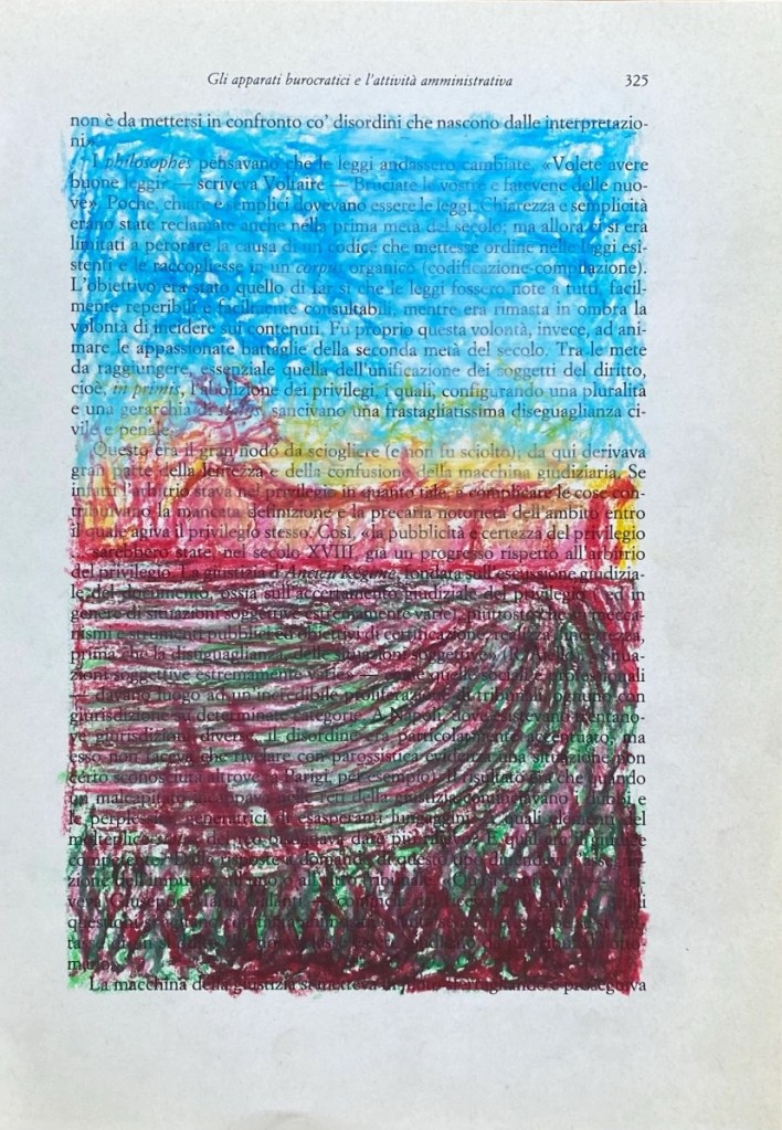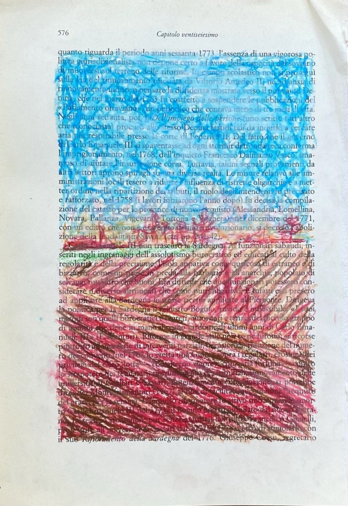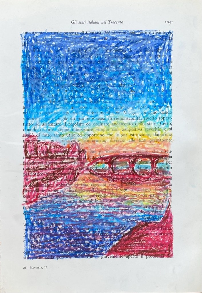 The Ciao Drawings (2022) are another form of collecting and remembering these pieces of reality, and fragments of time. The chalk on book paper drawings form a different perspective on some of my travels through Italy.