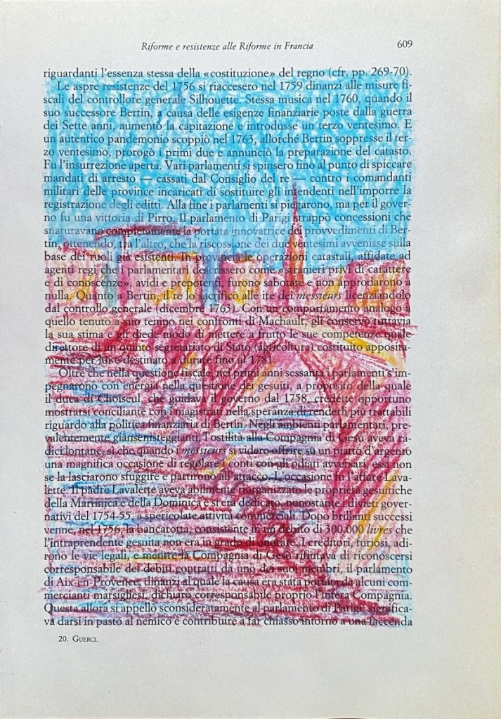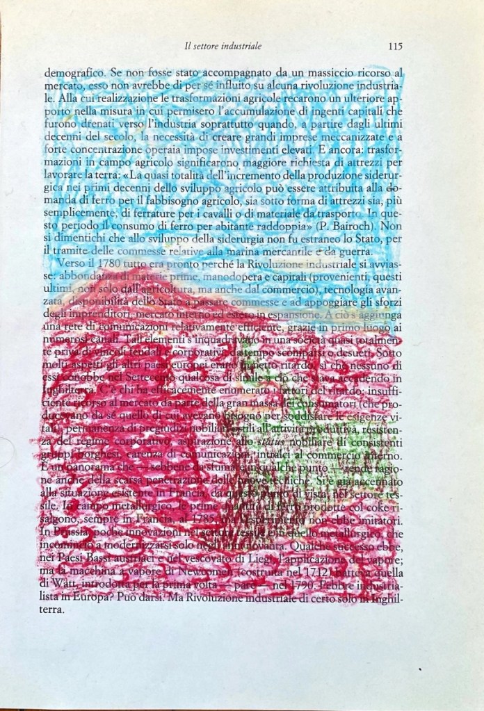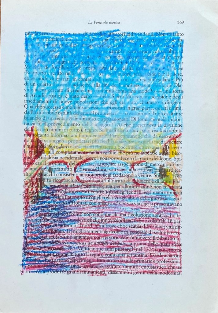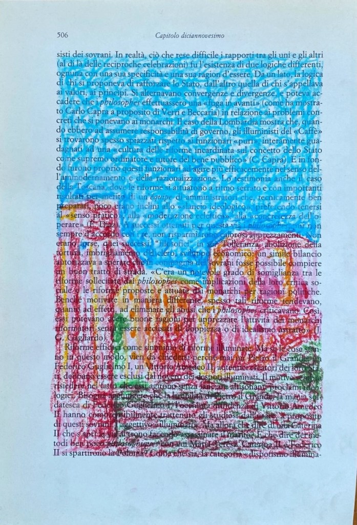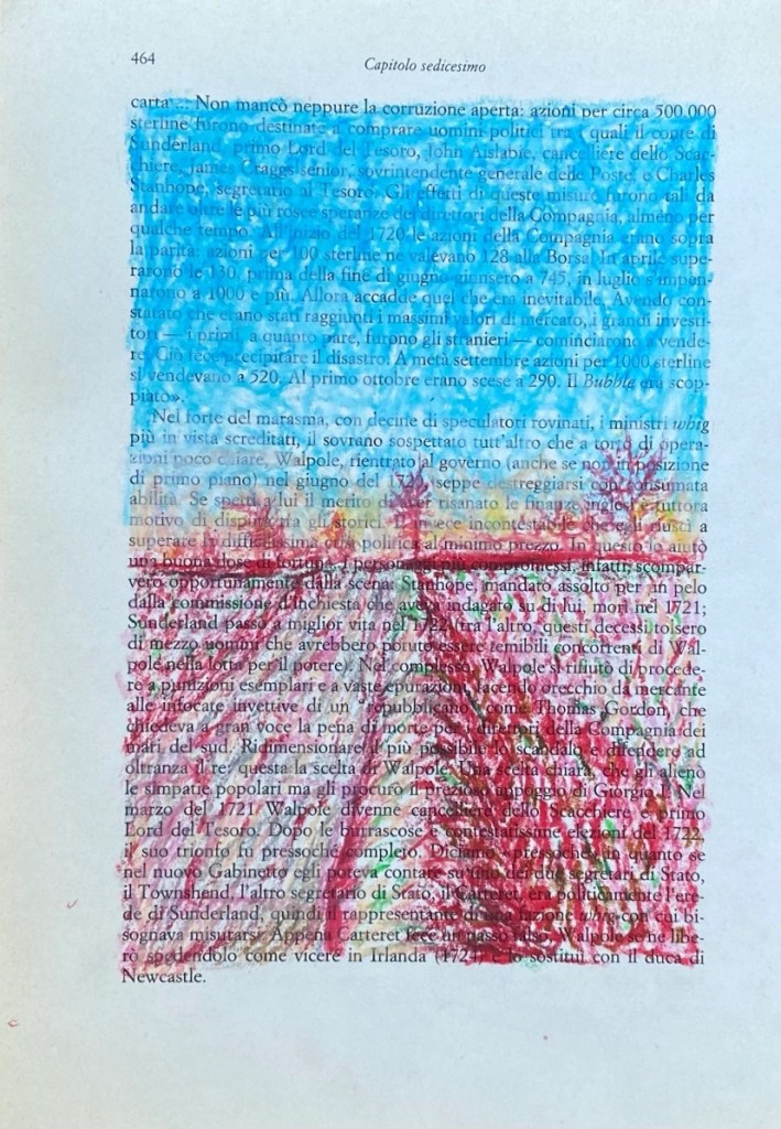 The Ciao Drawings (2022) are another form of collecting and remembering these pieces of reality, and fragments of time. The chalk on book paper drawings form a different perspective on some of my travels through Italy.